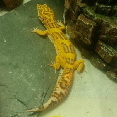 Son Histoire : Vendu par l'éleveur à un détenteur terrariophile, celui ci l'a remis en vente quelques mois après... A la base je devais m'orienter vers le Correlophus ciliatus mais j'ai craqué sur ce petit gecko léopard et on m'avait fait une offre que je ne pouvais pas refuser. Au fur et à mesure, j'ai fini par craquer de plus en plus au point de lui trouver des femelles mais sans projet de reproductions particulières. Depuis il a eu plusieurs enfants qui lui ressemblent à peu près, que ce soit en terme de couleur mais aussi de caractère.